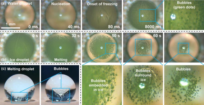 Water droplet icing on solid surfaces has been intensively studied in recent years but still with many mechanisms unrevealed. Here, we report a bubble formation phenomenon that always occurs in freezing droplets, from millimeter-sized sessile droplets to microscale condensed droplets, during icing and condensation frosting. In the second stage of icing (the first stage is nucleation and recalescence), air dissolved in liquid water is separated out in the ice front, forming many isolated bubbles. Coupled with the droplet icing physics, a theoretical model was proposed to predict the bubble formation and elucidate its influencing factors. Due to the bubble formation, the final ice droplet is actually a porous medium, rather than a complete solid ice. These results bring new insight into icing physics, helping modify icing models and improve anti-icing and deicing techniques.